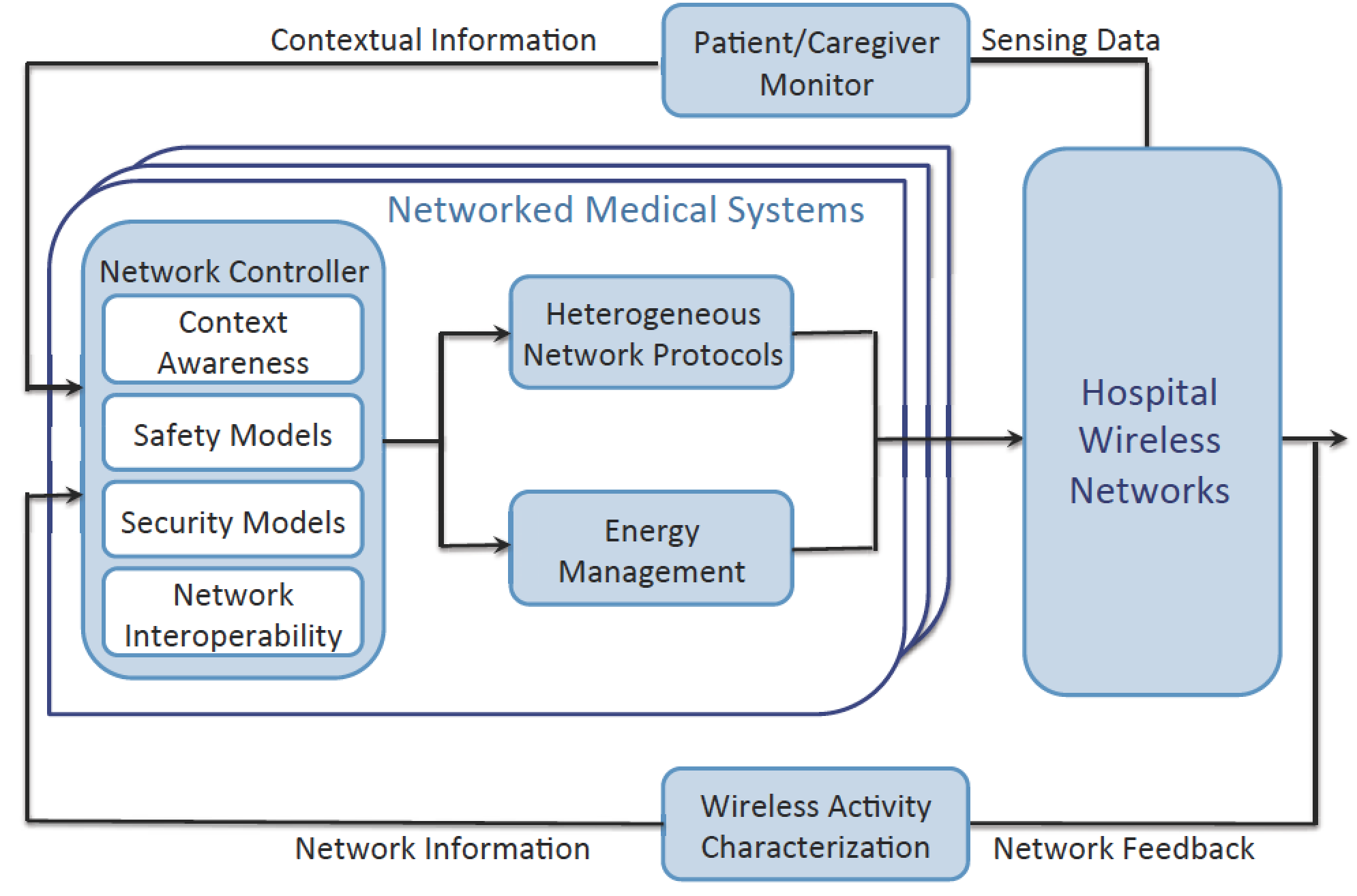 - Under the reliability and safety requirements of medical applications, we design and develop a set of technologies to coordinate data collection across heterogeneous wireless networks, control electromagnetic interference, configure and optimize operations of medical devices.